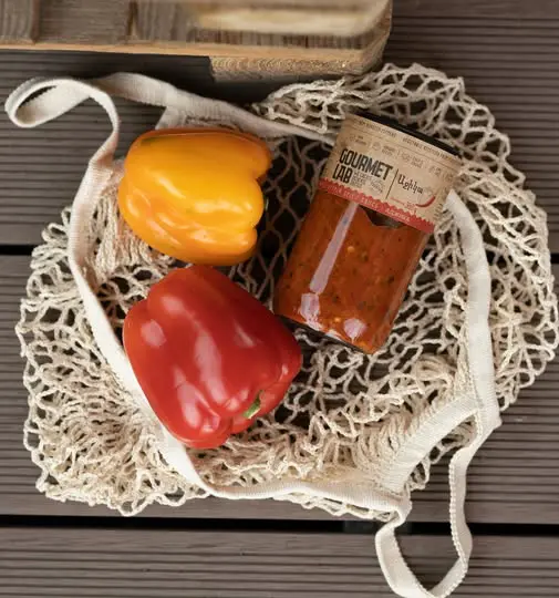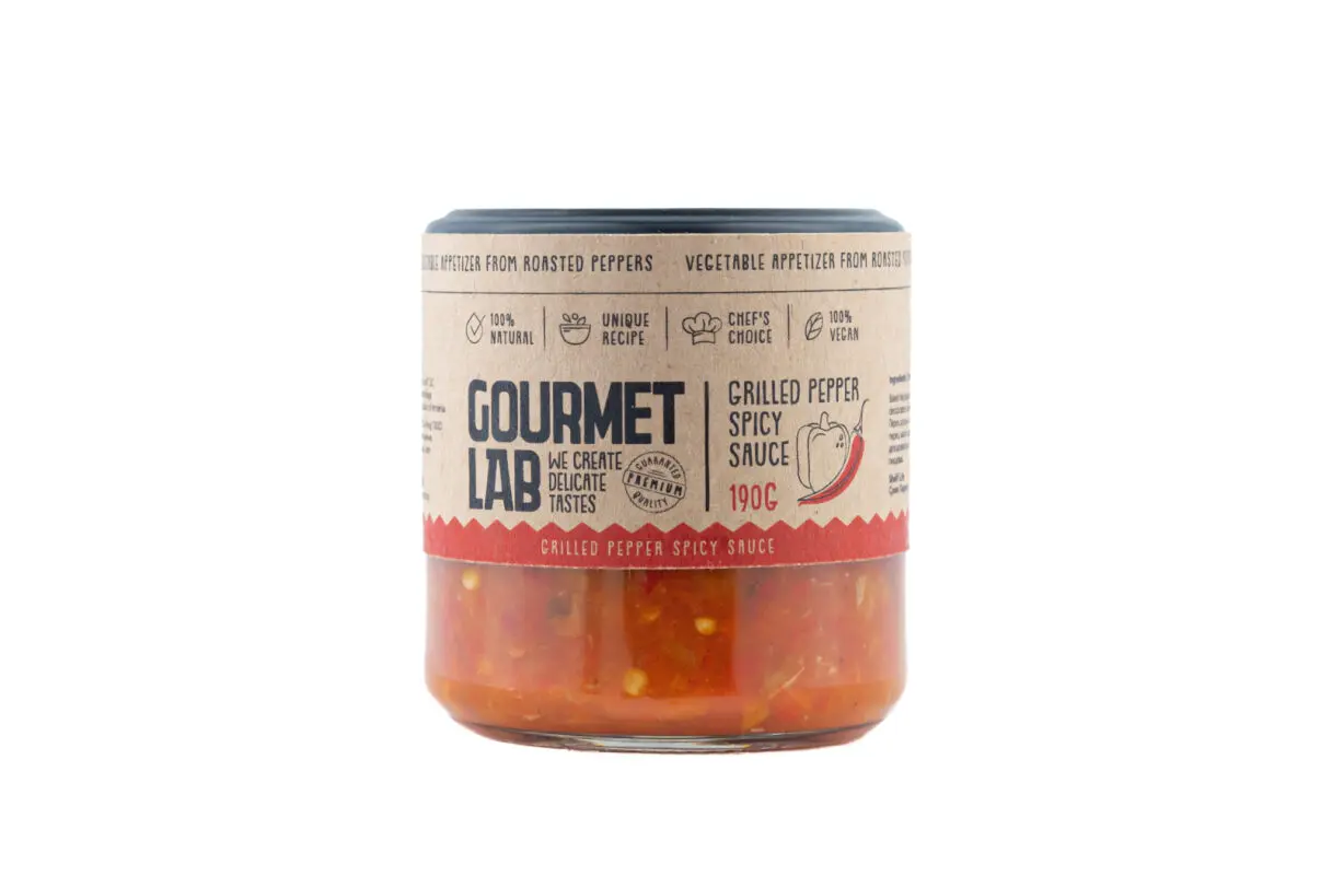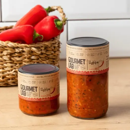 Խորոված կարմիր պղպեղ, լոլիկի մածուկ, արևածաղկի ձեթ, սխտոր, չիլի, մաղադանոս, աղ,