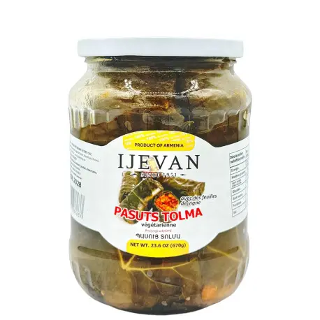 Weintraubenblätter, Rote Bohnen, Kichererbsen, Linsen, Emmer, Bulgur, Gelbe Erbsen, Zwiebeln, Petersilie, Tomatenmark, Sonnenblumenöl, Gewürze, Wasser, Salz,